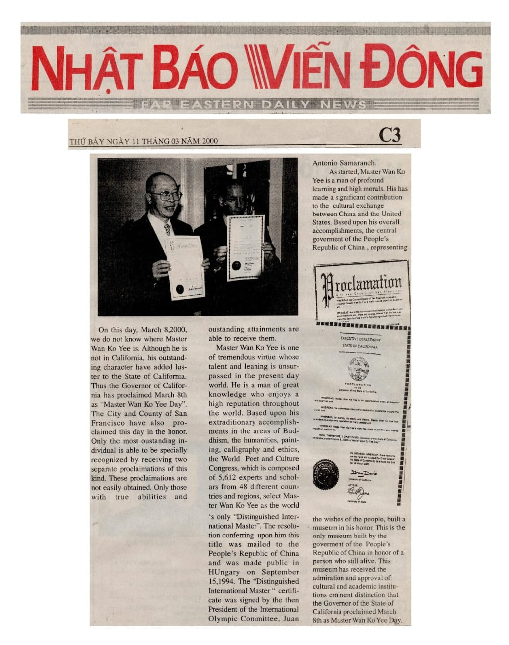 On this day, March 8,2000, we do not know where Master Wan Ko Yee is. Although he is not in California, his outstanding character have added luster to the State of California. Thus the Governor of California has proclaimed March 8th as "Master Wan Ko Yee Day". The City and County of San Francisco have also proclaimed this day in the honor. Only the most oustanding individual is able to be specially recognized by receiving two separate proclamations of this kind. These proclamations are not easily obtained. Only those with true abilities and oustanding attainments are able to receive them.