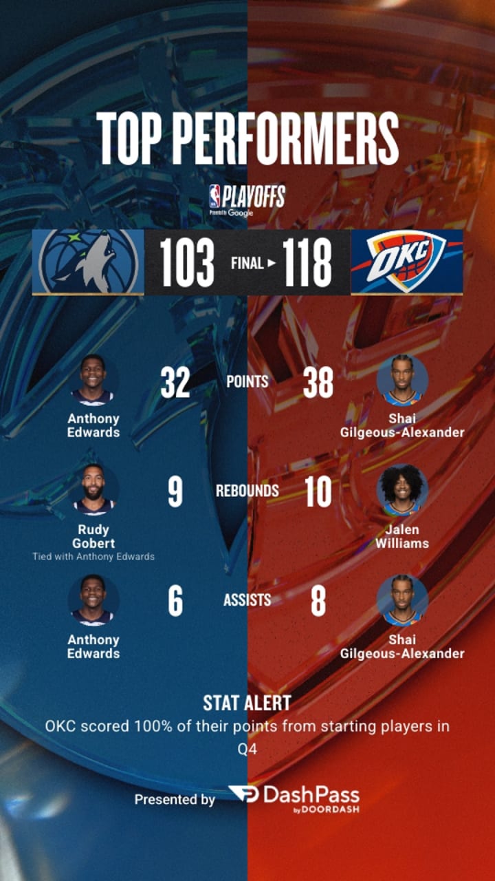 Minnesota started the game with better offensive flow, finding more success in paint penetration and connecting on some timely three-pointers, something that was conspicuously absent in their Game 1 performance. Anthony Edwards, responding to a relatively subdued Game 1, came out attacking, taking 10 shots in the first quarter alone and finishing the half with 16 points. Despite this improved effort from the Timberwolves, particularly from Edwards, the Thunder still held a comfortable 58-50 lead at halftime, even while shooting a relatively cold 4-of-23 from beyond the arc. The simple fact was, Minnesota had no consistent answer for SGA, who matched Edwards' offensive output and then some, with Jalen Williams and Chet Holmgren also contributing significantly.