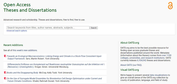 OATD (Open access Thesis and Dissertation) is established with the purpose to be the best possible resource for finding open access graduate theses and dissertations published around the world. With its continuous efforts, OATD currently indexes 6,104,042 thesis and dissertations from over 1100 colleges, universities, and research institutions. You can easy to get these free resource by clicking the thesis or dessertations from your search, which will bring you to the original website of the university owning such document to download.