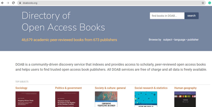 DOAB is a searchable database of peer reviewed scientific books that have been made accessible by academic publishers in open access. DOAB contains the metadata of 'free to share' e-books and provides direct links to the full text of the publications on the websites of the publishers.