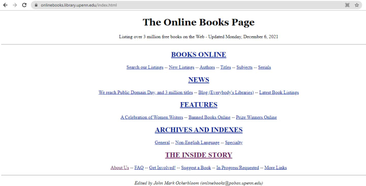 The Online Books Page was founded, and is edited, by John Mark Ockerbloom, a digital library planner and researcher at the University of Pennsylvania.