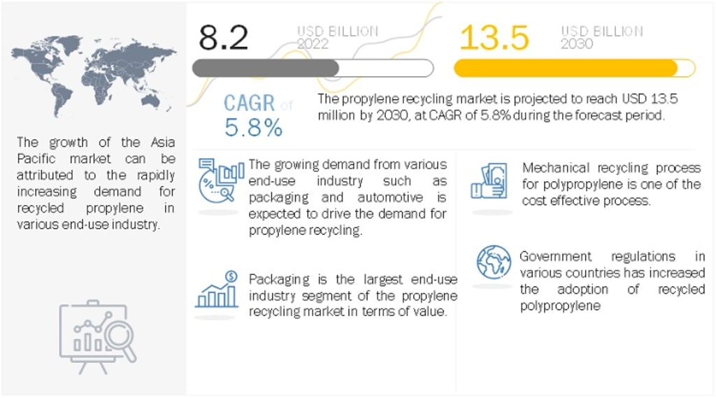 Polypropylene recycling is recovering polypropylene plastic from used or waste products. Polypropylene is a type of thermoplastic polymer which is used in a wide variety of products, including food packaging, plastic bags, medical supplies, and automotive parts. Polypropylene is strong, durable, and lightweight, making it an ideal choice for many applications. It is also recyclable, so polypropylene products can be recycled and used to create new products. Recycled polypropylene can create various new products, including new food packaging, furniture, and construction materials. The global polypropylene recycling market is expected to grow from USD 8.2 billion in 2022 to USD 13.5 billion by 2030, at a CAGR of 5.8% from 2022 to 2030.