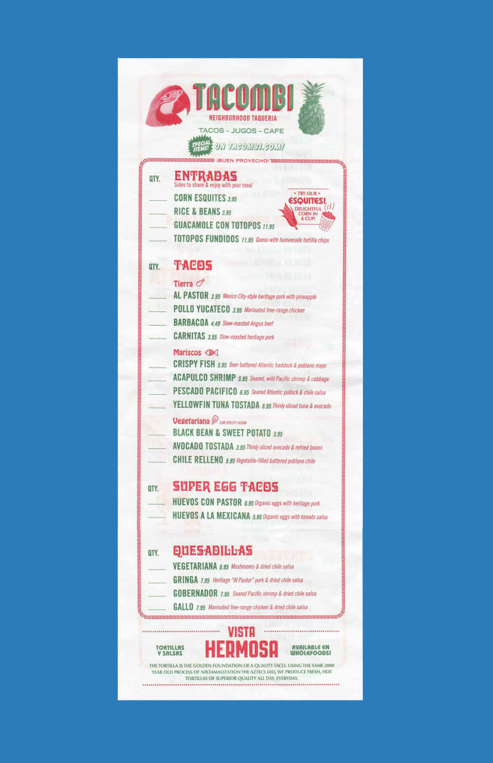 A few weeks ago after I finished meeting with a client, while walking down Lafayette ave, I randomly walked into a Mexican Style taquería—founded in a VW Kombi bus in Mexico City in 2005—called Tacombi and ordered Barbacoa tacos. Over the years the taquería has expanded from Mexico City to multiple locations in New York. What is great about this restaurant is not only the tacos but the branding and history behind it. Aesthetically, Tacombi pays homage to Chichén Itzá, in what is now Yucatán, known as one of the most advanced indigenous cultures of the ancient Americas 2500 B.C. Yucatan's cultural influence derives from a unique mixture of the Mayans, Lebanese, and Spaniards. During the 19th and early 20th centuries, The Lebanese migrated to Mexico and began incorporating the two cooking styles by grilling a vertical split of stacked meat slices and cutting it off as it cooks which helped to invent "tacos al pastor."