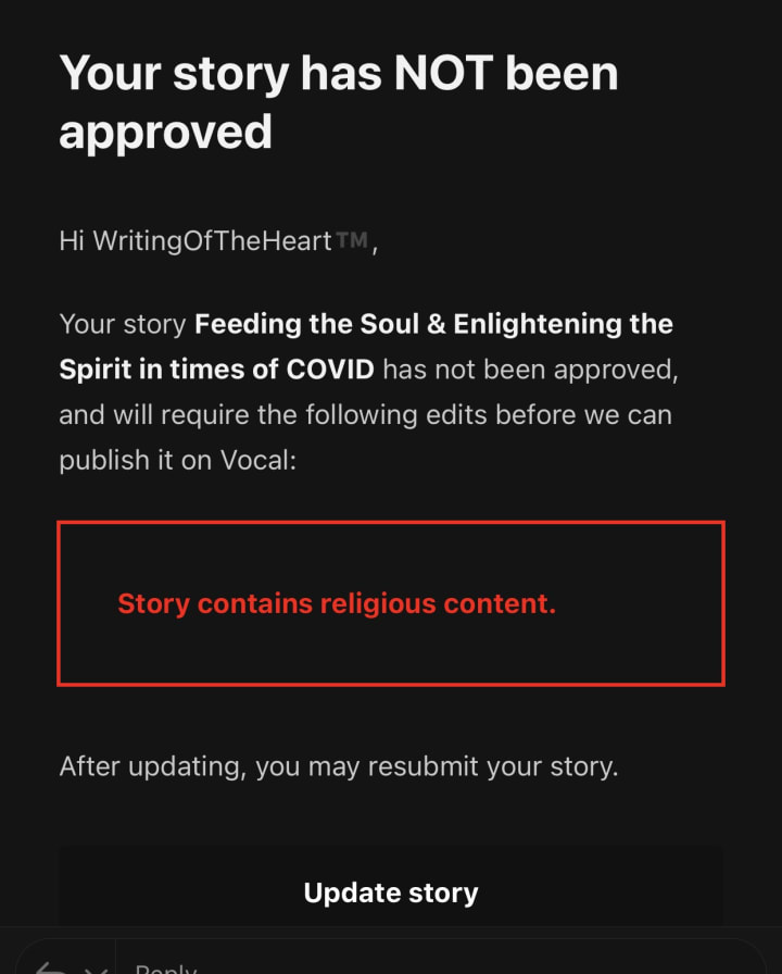 Nonetheless, what happens when it is ‘not approved, when that email pops-up in your inbox - it’s supposed to say ‘congratulations your story has been published’ and not ‘your story is ‘NOT approved’ - like what the heck, back to the ‘drawing board’ we go, and dearest Vocal team - why does ‘NOT’ have to be written in cap-locks (that’s another matter, for another day).