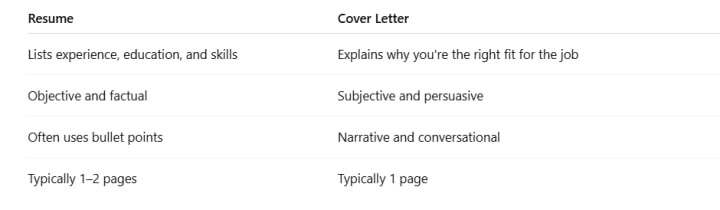 A cover letter is narrative and personalized, while a resume is structured and fact-based. The letter explains why you're a fit; the resume shows how you're a fit.