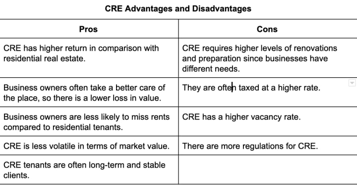 Here are the advantages and disadvantages that come with CRE that both owners and realtors should be aware of: