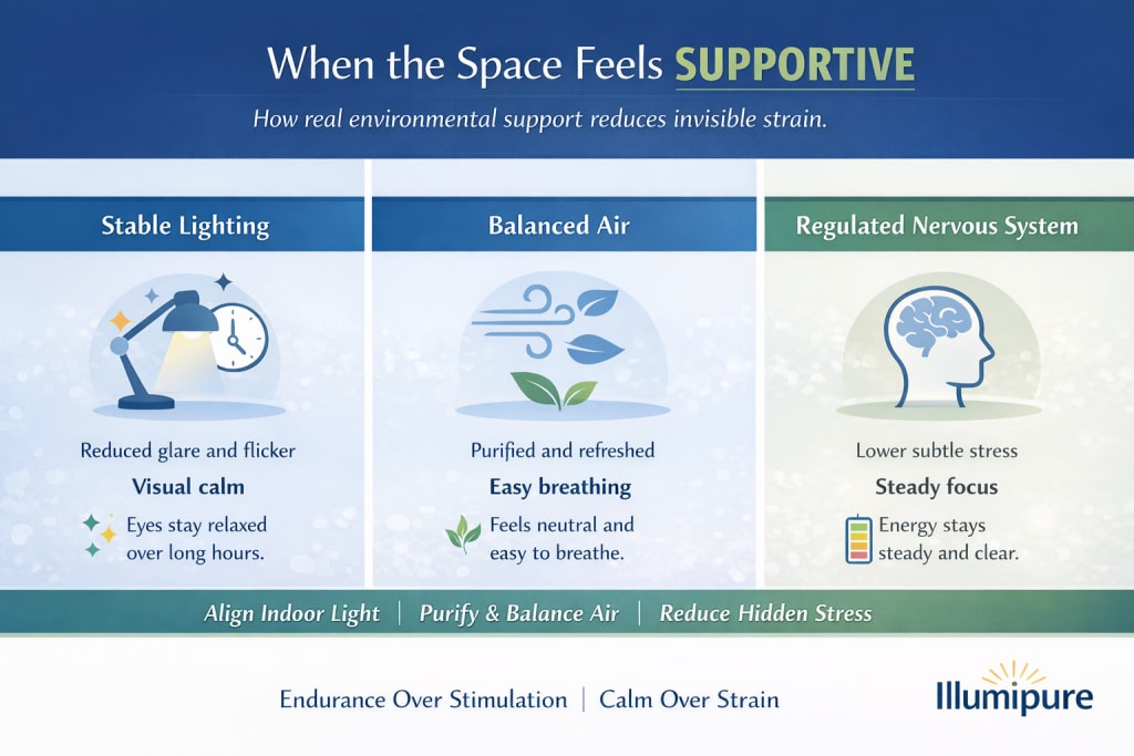 A supportive space reduces those stressors. It stabilizes light in a way that aligns with circadian signaling. It maintains air quality that allows efficient oxygen exchange. It minimizes visual noise so the brain can allocate resources to thinking rather than correcting.