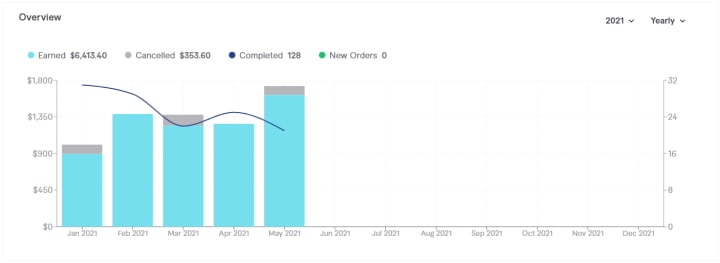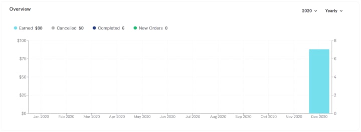 I had planned for a slow start, so when things suddenly spiked in January I was definitely surprised. I started my prices very low to attract customers and generate good reviews, but I was quickly overwhelmed with the amount of work. Fiverr has a few different "seller levels" that seller achieve as they reach certain goals with their revenue, order number, and reviews, so as soon as I hit the first level I immediately bumped up my prices.