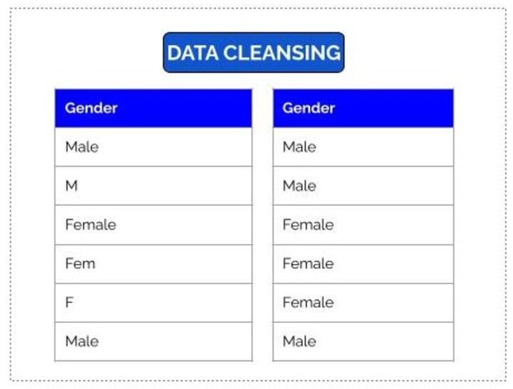 Here, you can see instances of incorrectly formatted data. Once it undergoes the process of data cleansing, all the incomplete entries (M, F, or Fem) get processed accurately.