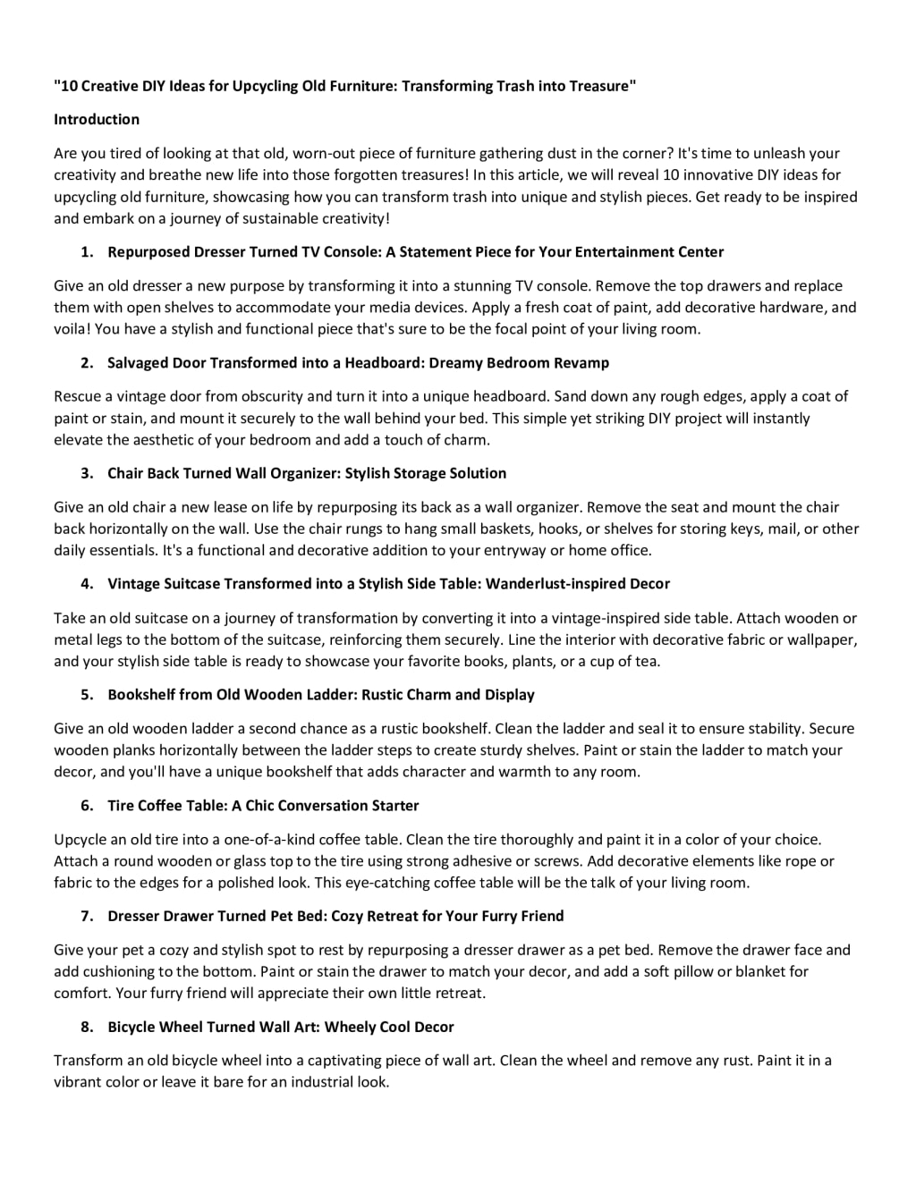 Are you tired of looking at that old, worn-out piece of furniture gathering dust in the corner? It's time to unleash your creativity and breathe new life into those forgotten treasures! In this article, we will reveal 10 innovative DIY ideas for upcycling old furniture, showcasing how you can transform trash into unique and stylish pieces. Get ready to be inspired and embark on a journey of sustainable creativity!