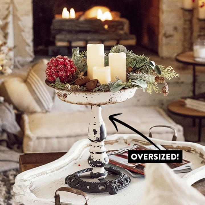 One of the keys to creating a beautiful, homey space is varying the heights of your smaller decor items. This metal compote makes that an easy job, and it fits in perfectly with the farmhouse style that Joanna loves so much! Couldn't you just see something like this in her own home?