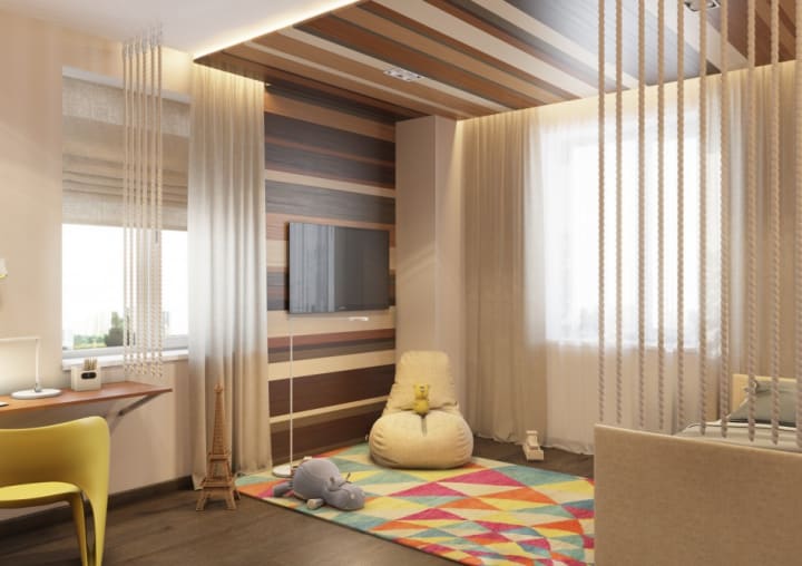 A pull-out bed is perfect for decorating a teen space in a minimalistic style. The main advantage of this functional piece of furniture is that its part for sleeping can be pushed out at night and pushed in the daytime. For additional space savings, it is best to install transformable furniture. The room in this design will be an ideal area for active games and creative activities.