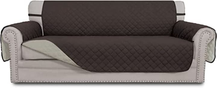 The Easy-Going Reversible Couch Cover is a high-quality sofa cover made of elegant quilted texture and thick microfiber that is colorfast and water-resistant. It is reversible with two color options, making it double the use. The sofa cover fits seat widths up to 66 inches, but it's important to measure before purchasing. The cover features elastic straps and a longer over the arm flap to make the fabric more tight and prevent sliding.