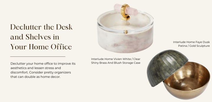 Declutter your home office to improve its aesthetics and lessen stress and discomfort. Consider pretty organizers that can double as home decor. To help yourself get organized, pick up the Interlude Home Faye Dusk Patina / Gold Sculpture or the Interlude Home Vivien White / Clear Shiny Brass And Blush Storage Case from Top Modern for paper clips, sticky notes, wall tacks and other office supplies.