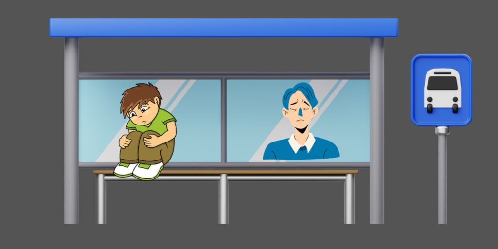 He took a seat at the far end of the shelter but kept his unwavering gaze on me. Something about him was undeniably unsettling; he appeared to be either intoxicated or under the influence of drugs. Breaking the silence, he asked, "When is the bus due?"