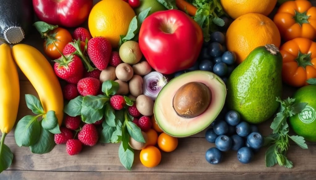 A vibrant and colorful arrangement of fresh fruits and vegetables on a rustic wooden table, showcasing a variety of shapes and textures, including leafy greens, juicy berries, ripe avocados, and bright citrus fruits, with a soft natural light illuminating the scene to evoke a sense of health and vitality.