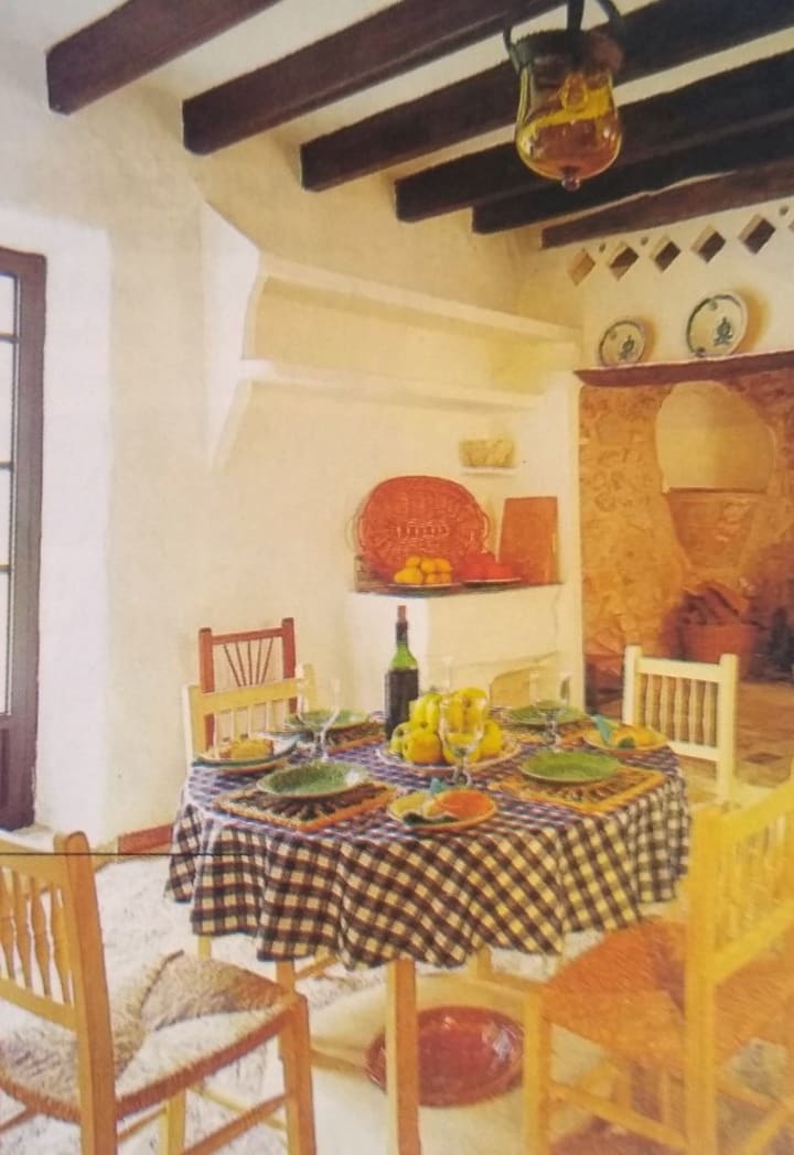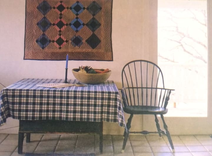 Simple fabric design of tablecloth complements geometric pattern of wall hanging. Placement of tablecloth allows glimpse of interesting furniture underneath