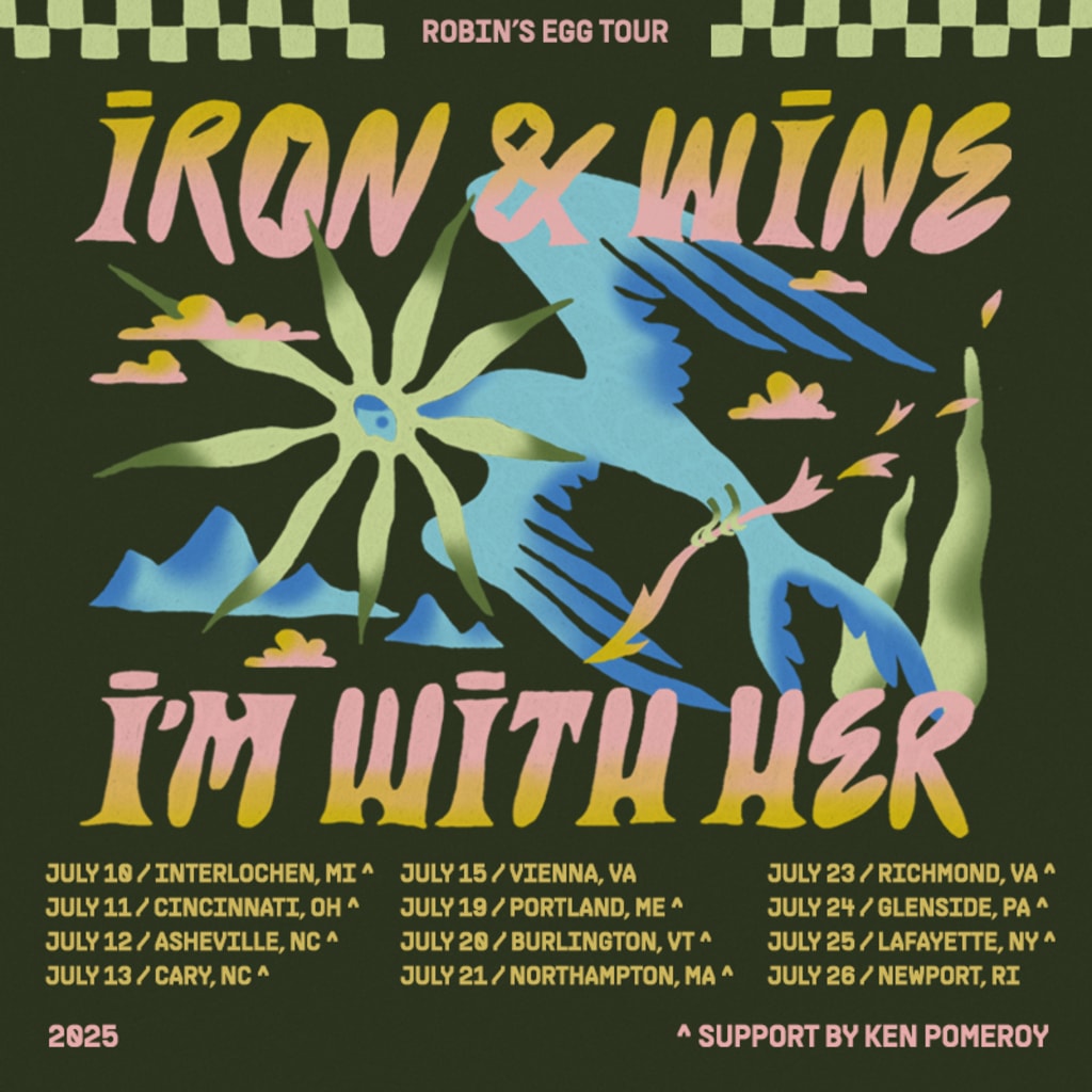 - Polished Typography: The band names ("Iron & Wine" and "I'm With Her") would be in a plain, perhaps handwritten or folk-type font, supported by the tour name "Robin's Egg Tour 2025," creating an timeless appearance.