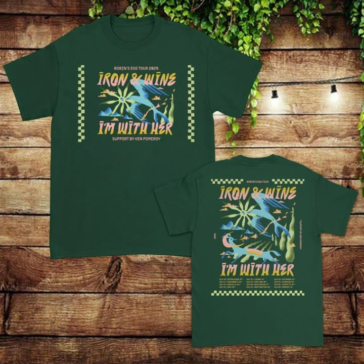 For the sake of commemorating this unprecedented collaboration and the serene beauty of the "Robin's Egg Tour 2025," a unique Iron & Wine And I'm With Her Robin's Egg Tour 2025 T-shirt would be an excellent souvenir for any fan. Imagine a product that captures the essence of this unique musical encounter: