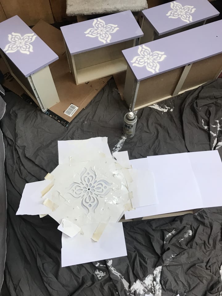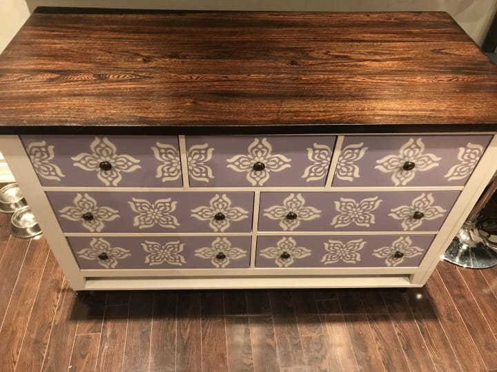 How I did it: I got paint off of Facebook Marketplace. I knew I wouldn't need a lot and buying a quart of fresh paint is around 40-60 dollars at a hardware store. I ended up getting two half-used cans of blue and red paint from a woman who had leftovers from painting her toddler's bedroom. I mixed them together and made a nice purple color to paint the drawers with. I unscrewed the dresser nobs and painted away. After the three coats of the solid color dried, I cut up a stencil sheet to the exact design I wanted and covered the rest of the purple with cut-up paper so it wouldn't get any spray residue. Then I spray-painted the stenciled design white to make it more me.