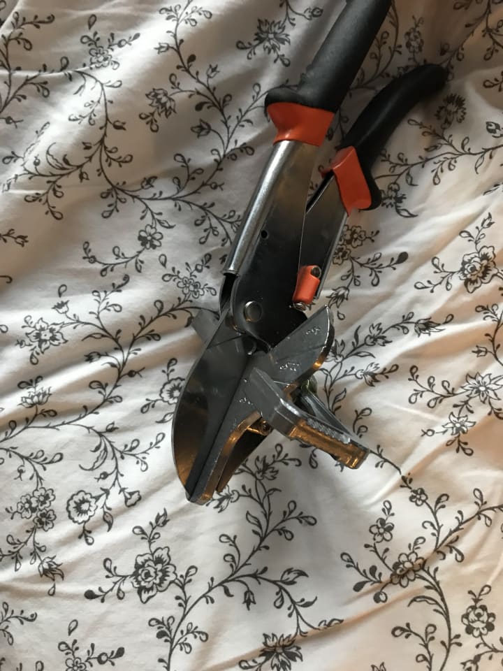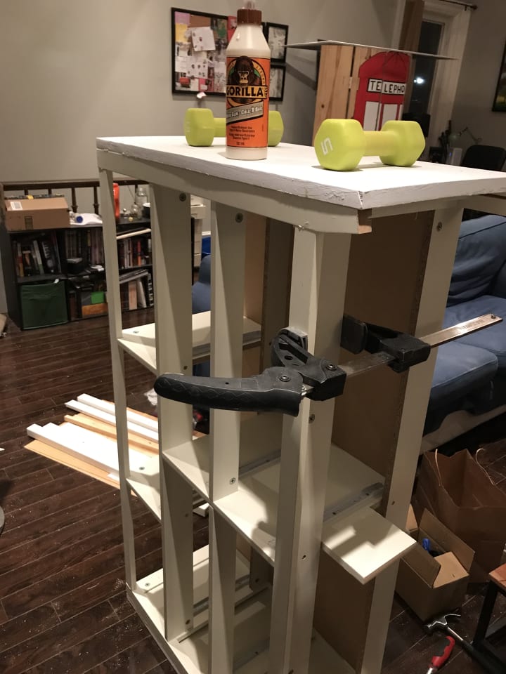 How I did it: When you are making something that you will store a lot of things in, as well as use every day, you want to make sure it is strong. This dresser originally didn't have many screws in it but was pieces together using small wooden dowels. I took the entire thing apart and pieced it back together (excluding the dresser top, since I would put a countertop over it) using gorilla glue and multiple screws to make it invincible. Because it was wood I predrilled holes with my bit so it wouldn't split the dresser when I screwed it together. I also made twice as many dowel holes with my drill bit and cut a long thin wood dowel to the sizes I wanted. I used wood scissors (miter shears) to cut the dowels to the size I wanted. This tool is much easier than trying to saw down something so dense and so small. Plus using wood scissors is very satisfying and quicker. Then after assembling with the glue, dowels, and screws in place, I put the clamps on tightly and let that baby dry overnight so the glue would be fully cured.