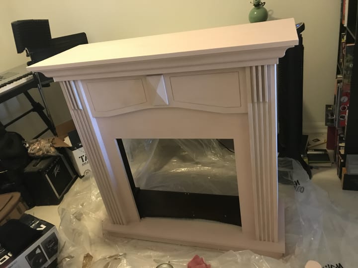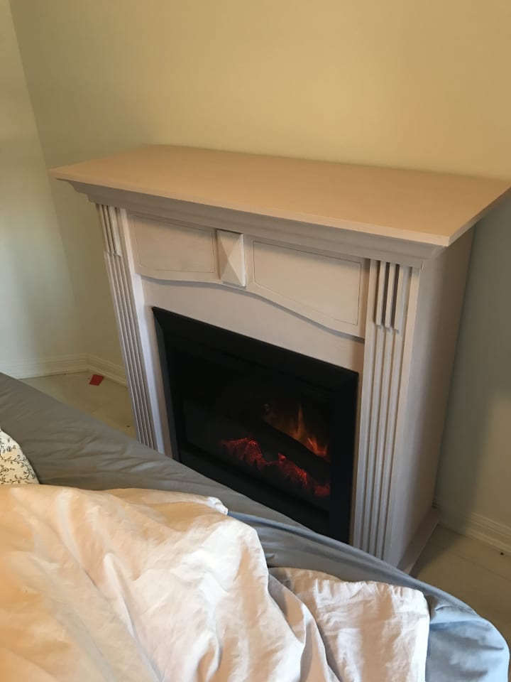 I bought a really nice electric fireplace on Facebook Marketplace for waaaaayyyyy cheaper than it should have been. I painted it pink with chalk paint and put a wax finish on it so it would match a pink blanket we have on our bed. It really completes the room. Plus, pink fireplace? Can't go wrong.