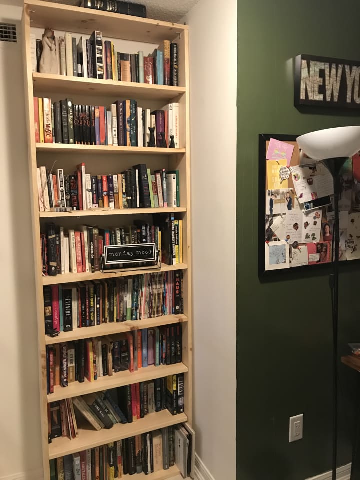 For the new apartment, we had an awkward corner that I wanted a floor-to-ceiling bookcase. To buy that tall of a bookcase is usually over $200 dollars minimum. So I made this one under 100. In the summer I am going to stain the wood on my balcony.