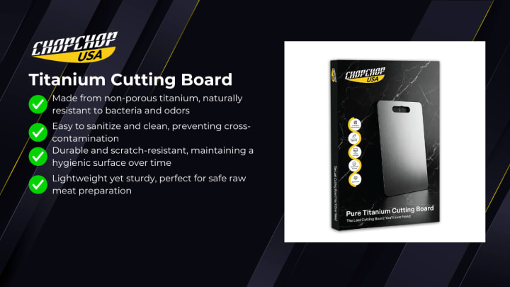 The ChopChop USA Titanium Cutting Board is engineered for those who prioritize hygiene, performance, and sustainability in the kitchen. Unlike wood or plastic boards, titanium doesn’t absorb moisture, harbor bacteria, or release microplastics.