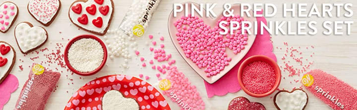 Celebrate love with this sweet Valentine's Day sprinkles assortment. You can't go wrong with classic pink, red and white! They're easy to mix and match for dessert decorating on your own or with a group. It's a quick and fun way to create adorable cookies, cupcakes, dipped pretzels, cake pops, brownies and more. This assortment includes 8 pouches so you'll have plenty of sprinkles to create the perfect sweet treats to share with your loved ones.