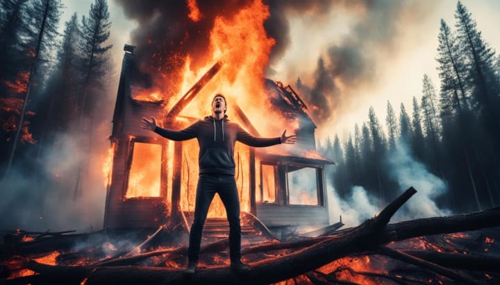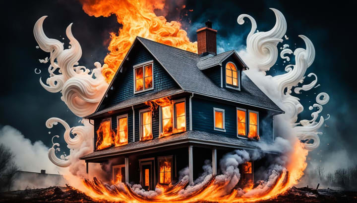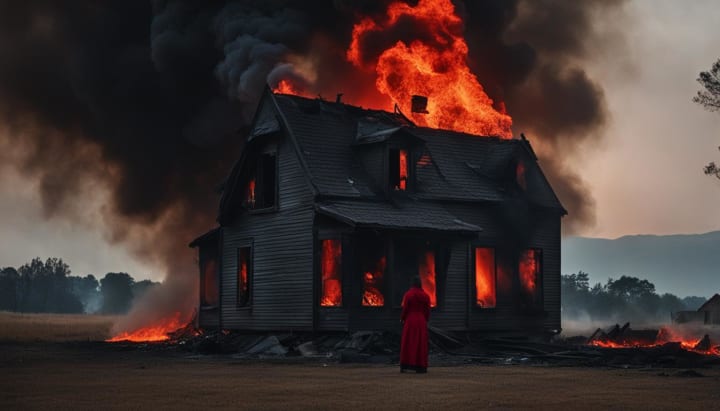 A dark, ominous-looking house with black smoke rising from its windows and doors. The surrounding area is engulfed in flames, and the sky is a deep shade of red. In the foreground, a person is standing with their back facing the burning house, looking overwhelmed and powerless.