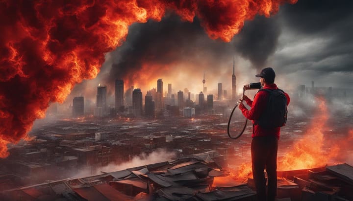 A fiery red house with smoke rising from within, surrounded by a swirling tornado of flames. A person stands in front, holding a magnifying glass and studying the flames. In the background, a city skyline is visible through the haze.