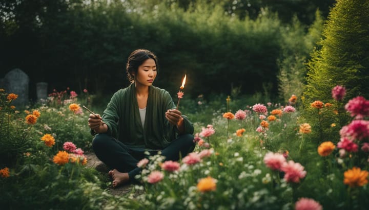 Create an image of a person sitting peacefully in a green garden, surrounded by blooming flowers and trees. The person is holding a burning matchstick in their hand, but they are unafraid. Their calm demeanor reflects their coping strategy of confronting their fears and finding solace in nature. The matchstick symbolizes their ability to take control of the situation and overcome any obstacles that come their way.