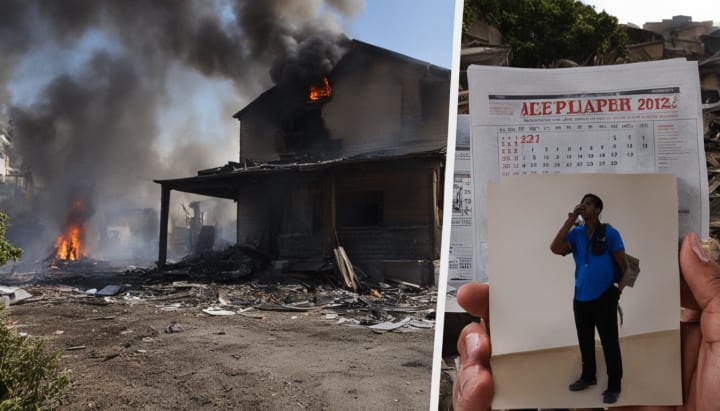 A person standing outside a burning house, holding a key and looking confused. In the background, there is a calendar with the date circled and a newspaper headline about a recent tragedy.
