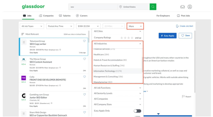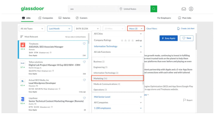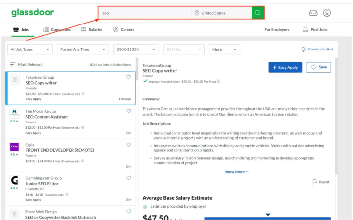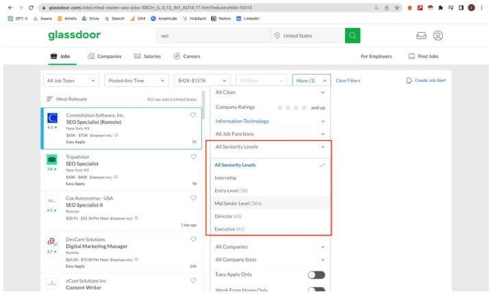 So, we go on Glassdoor (one of the hugest job search websites) and find companies who are looking for SEO specialists right now.