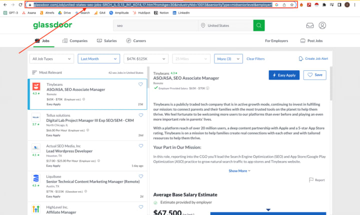 1. Go to Glassdoor account and copy the URL of the page with all applied filters.
