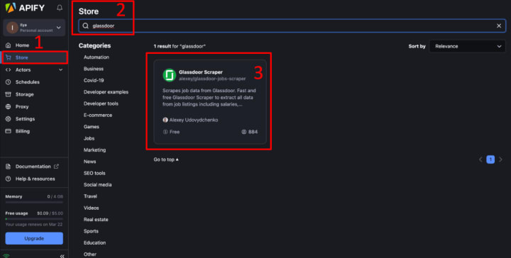 2. Now go to Apify and find Glassdoor script in the store
