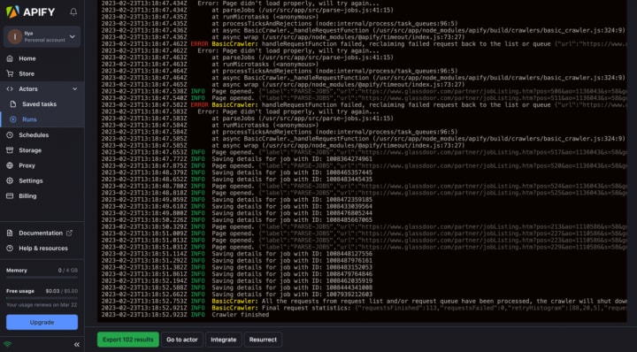 3. Put it into Apify’s Glassdoor scraping script. Press “Save & Start”… a few moments later…