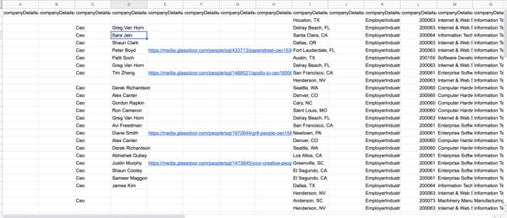 5. Upload it to Google Drive and open it in Google Sheets: As a result, you get a Google Sheet with companies who are looking for SEO specialists right now: