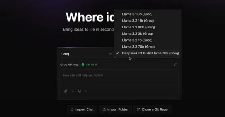 To exploit the potential of Deepseek R1, we’ll utilize the Groq API with Bolt DIY (an open-source development tool) that enables you to rapidly create and deploy programs.