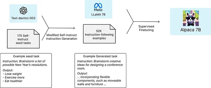 Take the Stanford Alpaca model as an example. Alpaca is a language model fine-tuned using supervised learning from a LLaMA 7B model on 52K instruction-following demonstrations generated from OpenAI’s text-davinci-003.