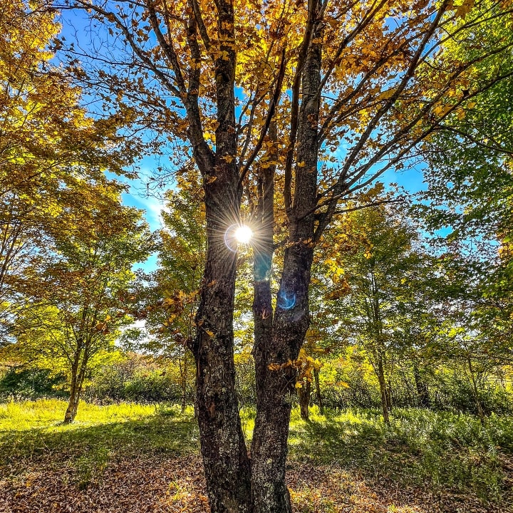 There are still beautiful vibrant trees, filled with colorful leaves.