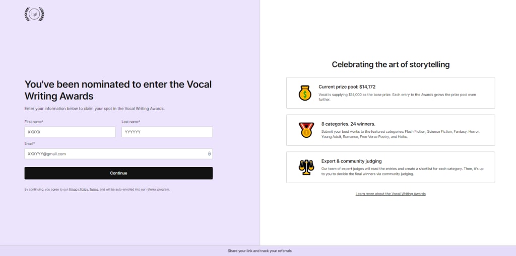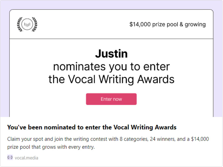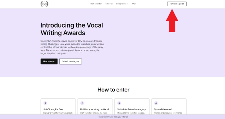 To access your exclusive nomination link, you have two options. Firstly, check your email for an invitation to the 2023 Vocal Writing Awards, where you will find the link provided. Alternatively, you can directly visit the official Vocal Writing Awards page. Once you're there, simply navigate to the "Nominate & get $5" button in the menu or click on the sticky purple bar located at the bottom of the website.