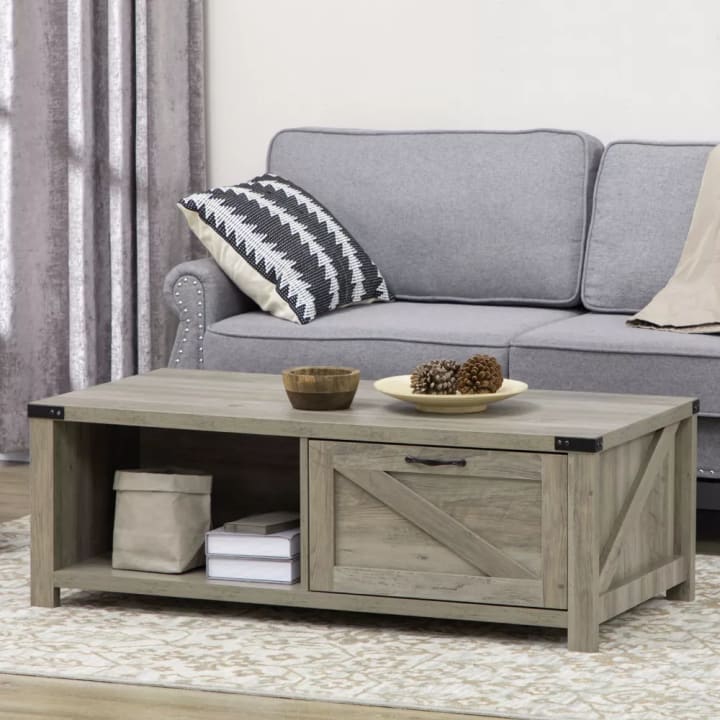 We love the barn style of this farmhouse coffee table! The light gray wood is a staple in the farmhouse style, and we love the accents of the black metal! Plus, this coffee table has storage built in, which is always a great idea.