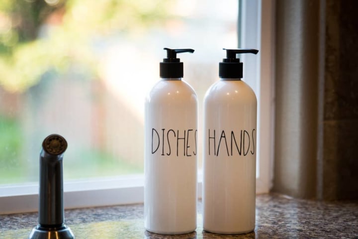 We love the typography and style of this eco-friendly refillable soap bottles! These are a great and easy way to bring some farmhouse charm into your kitchen, and will make your space look elevated when compared to just having the store-bought soap bottles out on your counter!