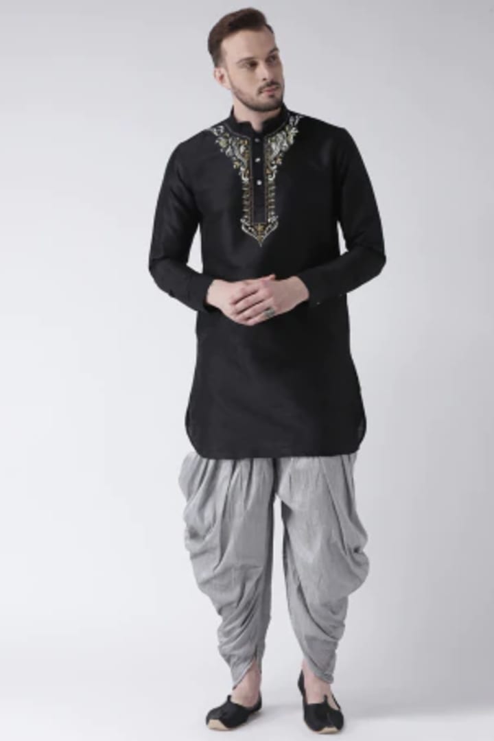 Indian men have started to embrace dhoti pants as their new fashion trend. A short kurta paired with dhoti pants creates a very authentic Garba look. You can find multiple kurta sets for men at Paaro, which come with dhoti-style bottoms.