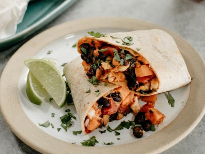 This is a healthy and satisfying meal that can be made in under 30 minutes. Bake a sweet potato in the oven until it's tender, then mash it with some black beans, diced tomatoes, and spices such as cumin and chili powder. Spread the mixture on a tortilla and roll it up. Top it with salsa and avocado for some extra flavor. Sweet potatoes are a good source of fiber and vitamins, while black beans provide protein and fiber.