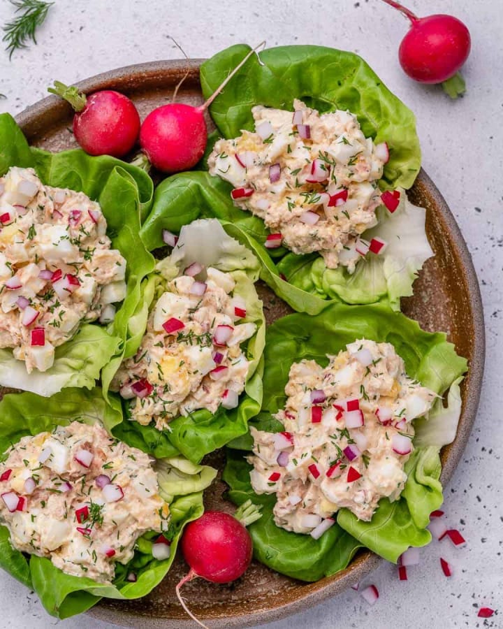 This is a low-carb and high-protein meal that can be made in under 10 minutes. Mix canned tuna with chopped celery, onion, and Greek yogurt or mayonnaise. Spoon the mixture onto lettuce leaves and roll them up. Tuna provides protein and healthy fats, while lettuce provides fiber and nutrients.
