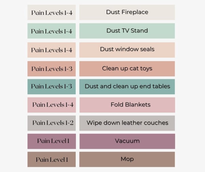 I created a master chore chart for every room in my home and assigned pain levels to each of my smaller tasks. I keep this on my computer so I have easy access to it each morning. Another great option would be to map it out in the back of your day planner or journal.