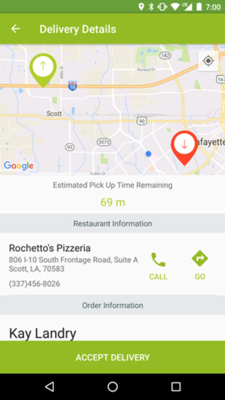 After you’ve finished the hiring session, you’re able to sign in to the app and begin taking orders. My favorite thing about the app is you’re able to see everything up front, including the customer’s address. Also, unlike DoorDash and Postmates, you never stand in line to order the food or guesstimate about the length of the time it will take you to get to the customer. As you can see from the screenshot below, you’re able to see the time until the food is ready. (69 minutes)