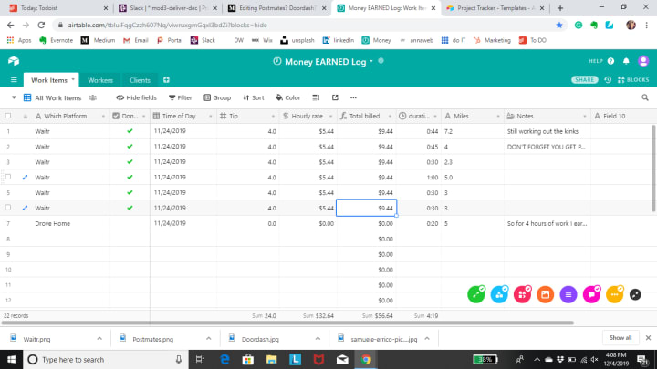 As you can see from this Airtable after working 4 hrs, I earned 56.64 at the very least. That’s $14.16 per hour. This was also my first day at Waitr while I was still working out the kinks.